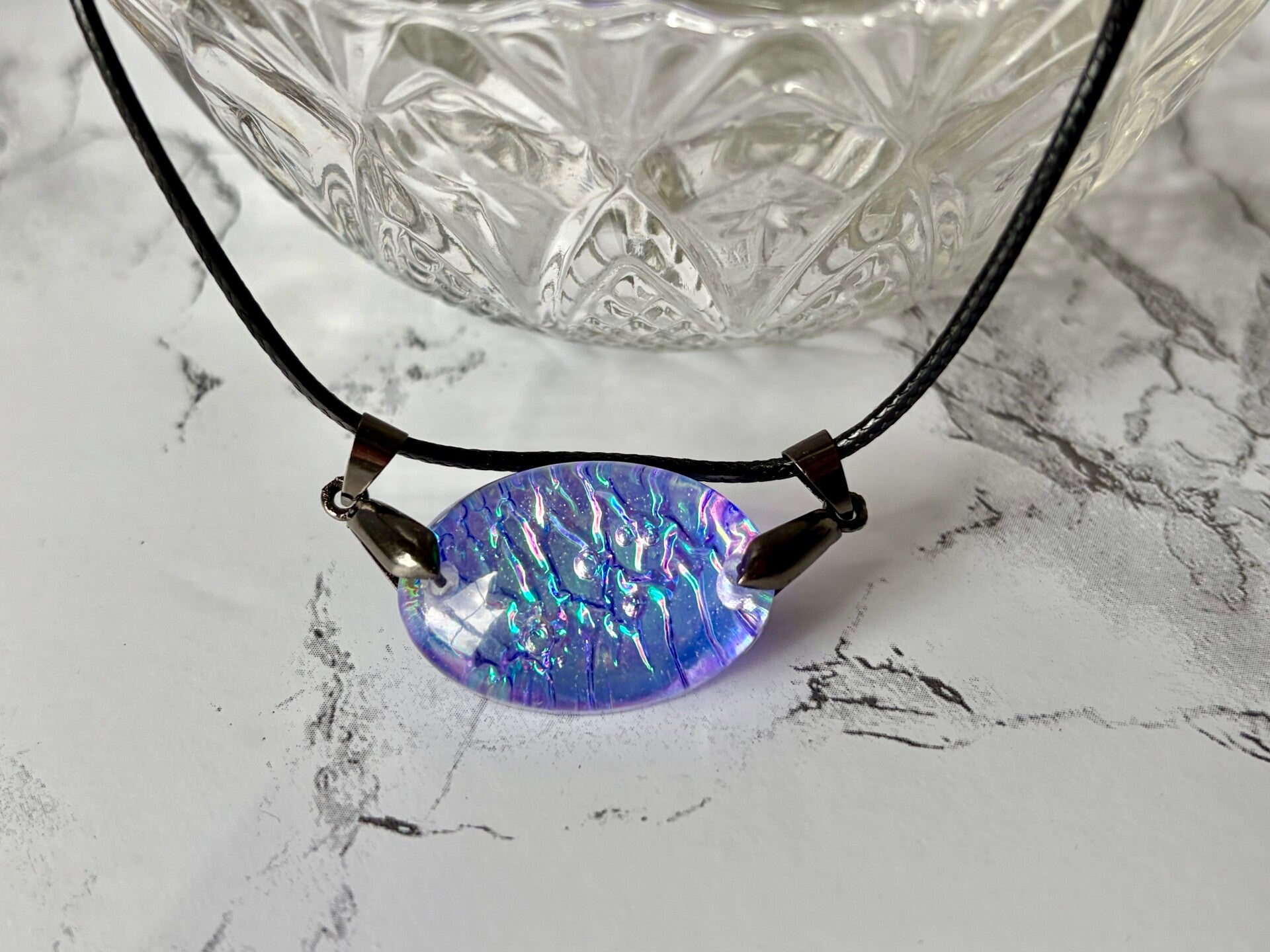 This oval shaped charm is made with Dihroic flim and gives off multiple colors depending on what lighting you are in.