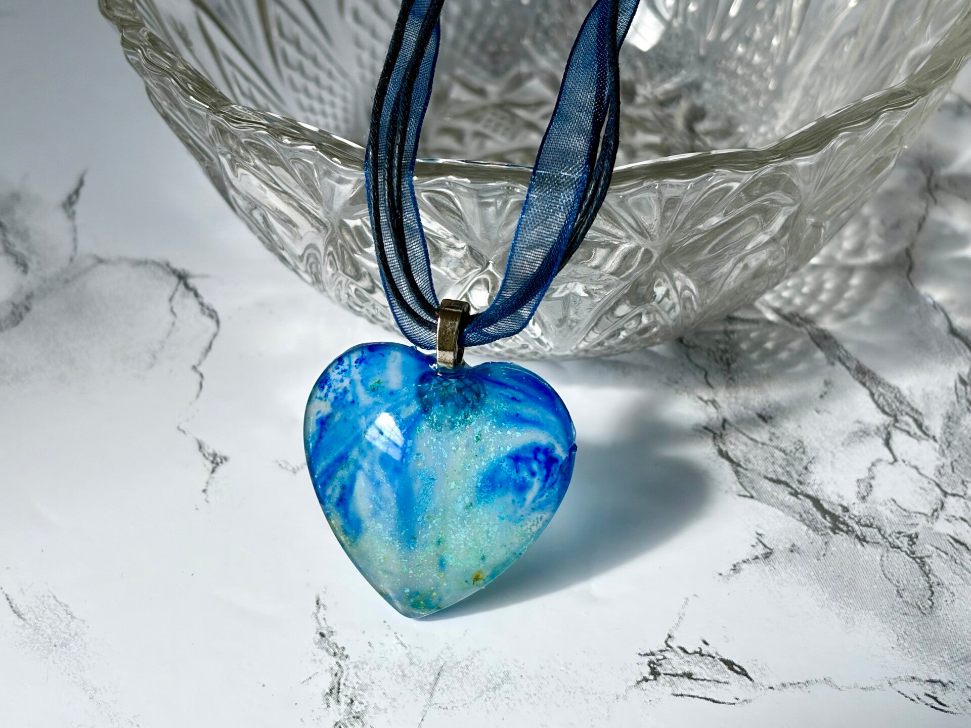 This resin heart is made with blues and greenish golds.