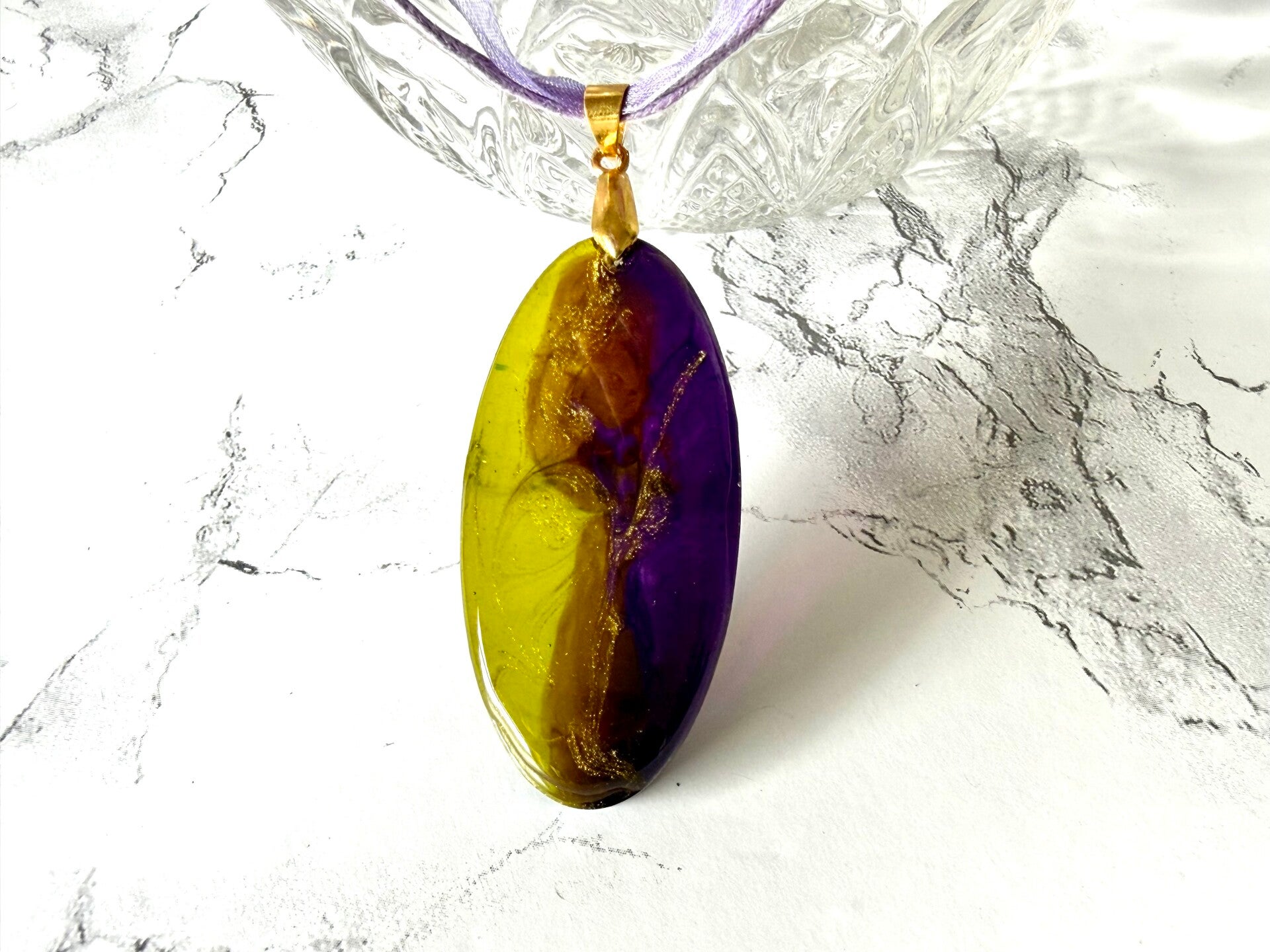 This resin oblong piece is made with a dark purple and a tea green color with gold accents.
