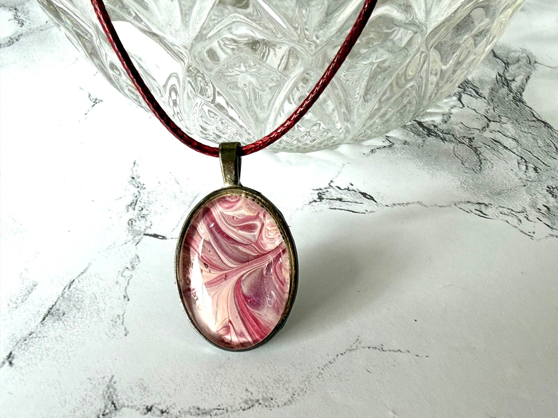 This piece is made from a paint pour with the colors of burgundy, pinks and a touch of purple.