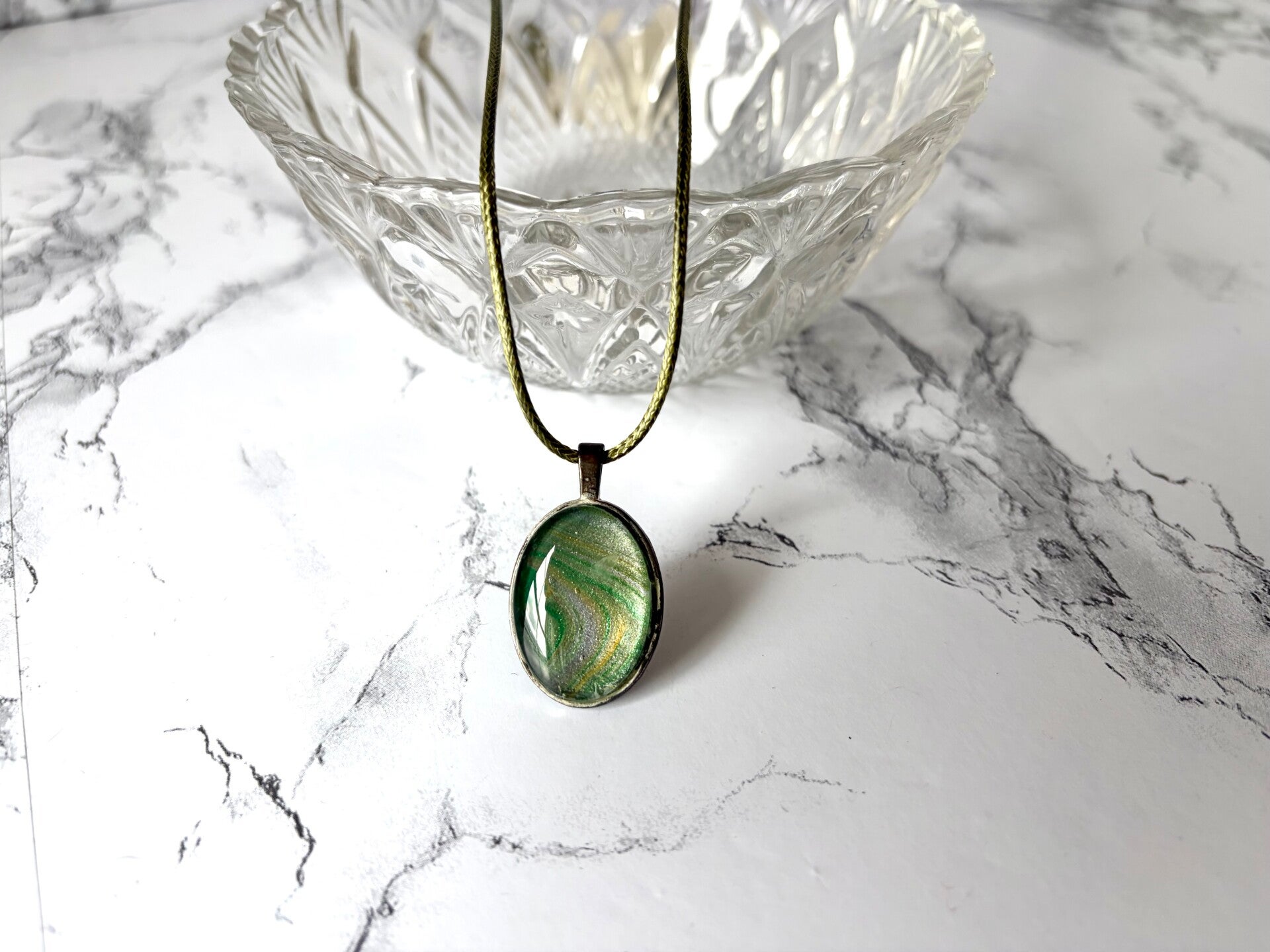 This piece is from a paint pour using all shimmer paints in greens, pink and yellow.