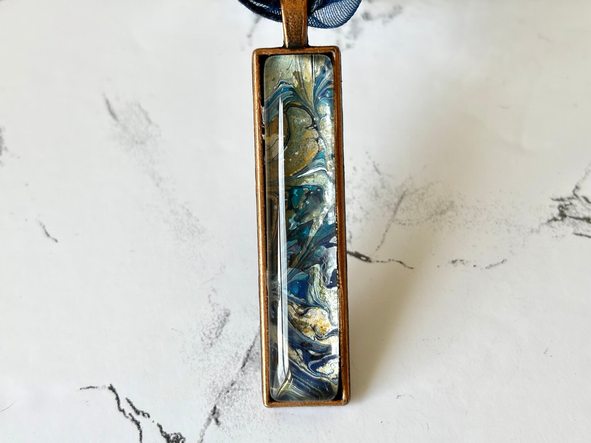 This piece is from a paint pour using blues, orange and silver.