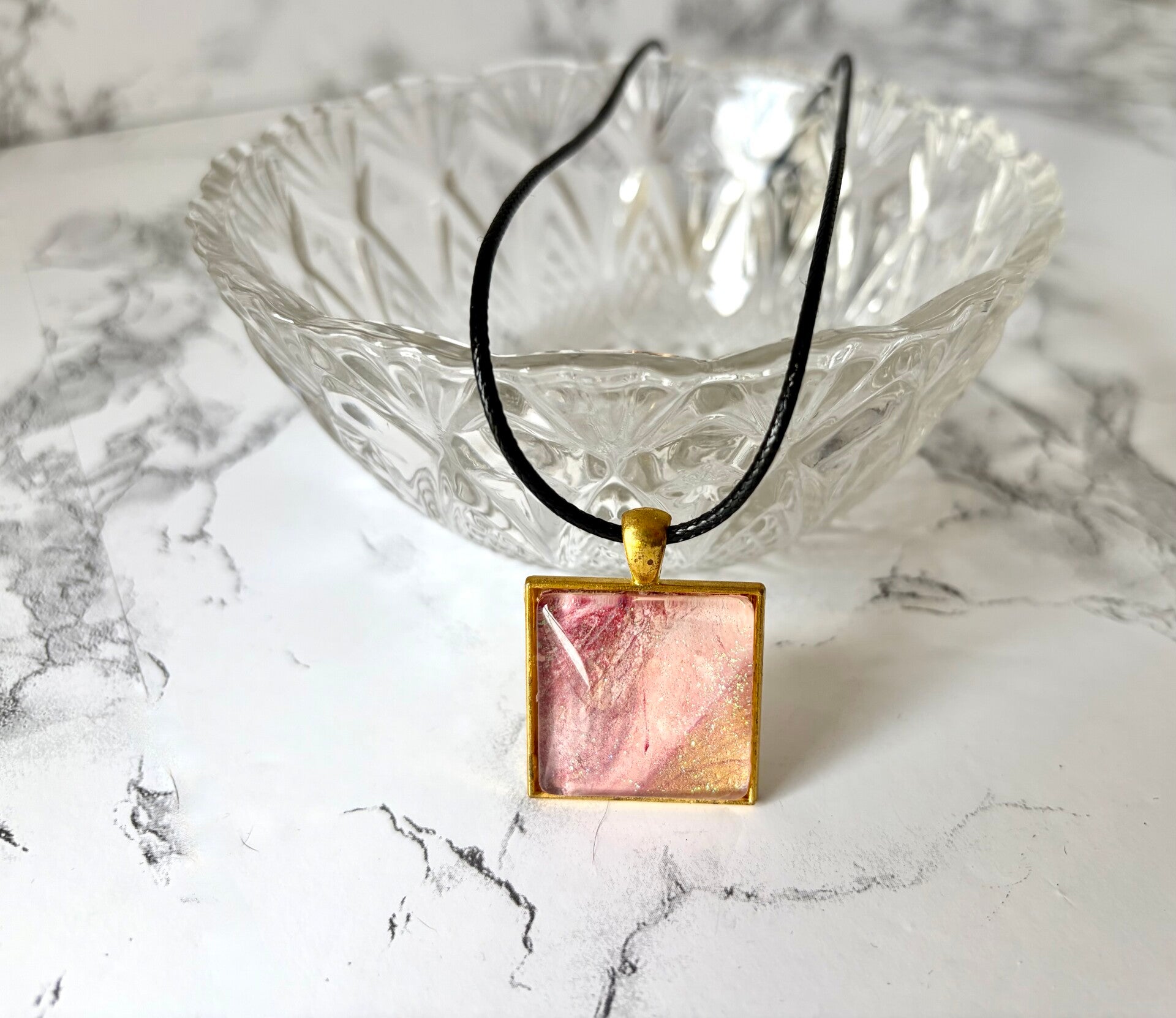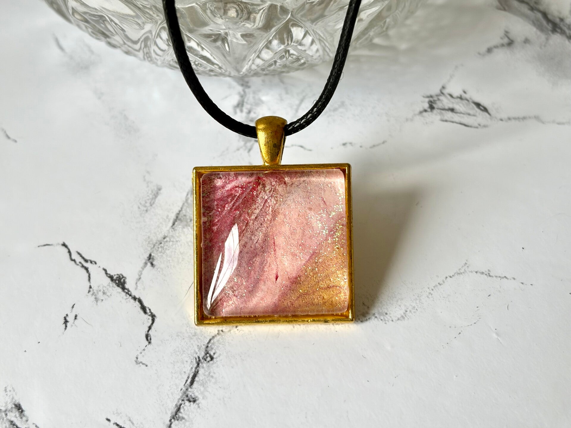 This piece made from a paint pour in pinks, gold and glitter.