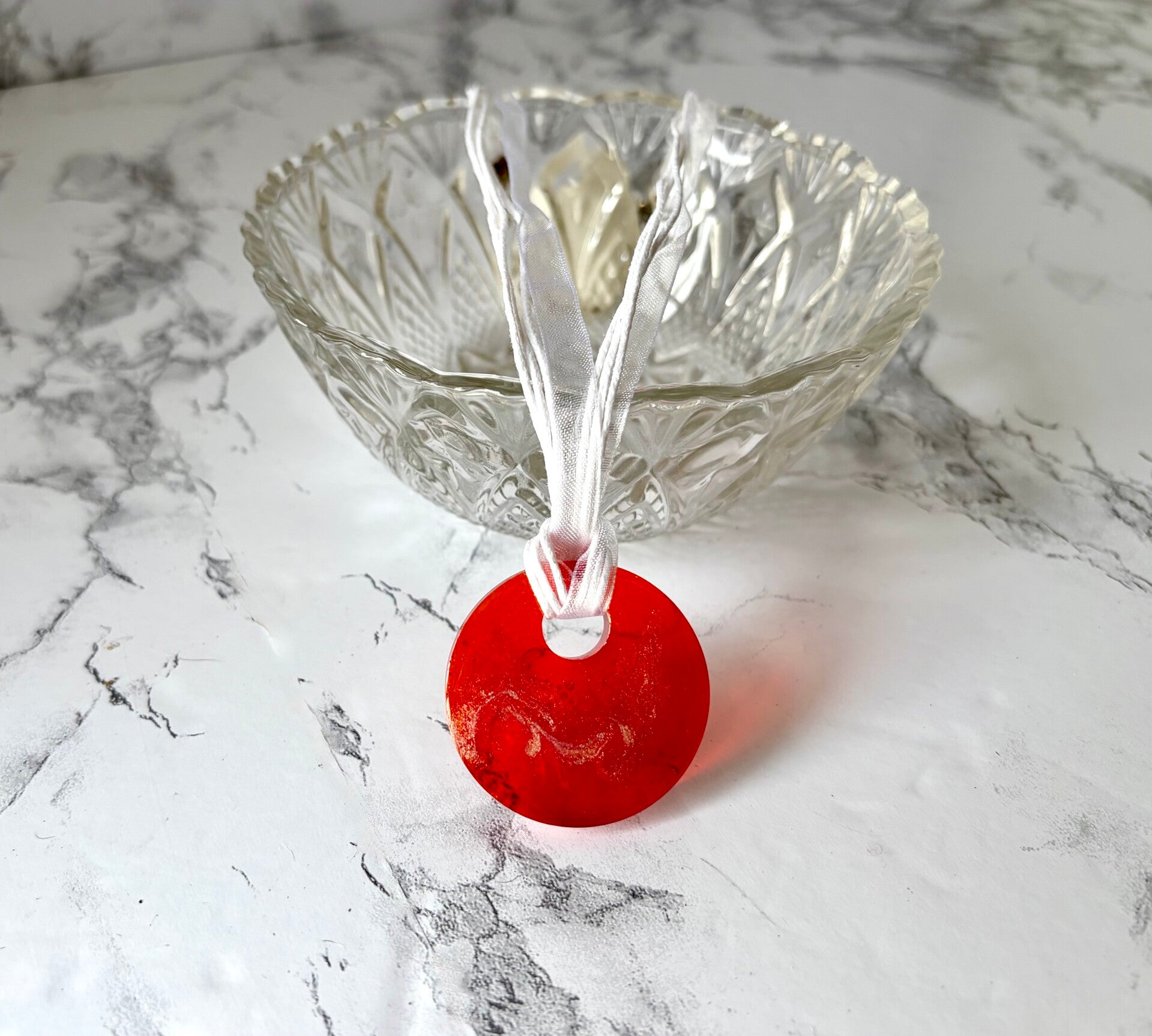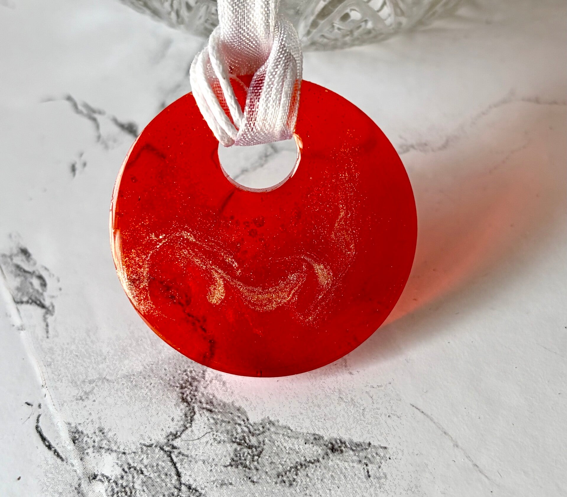 This resin round is done in red with silver shimmer.