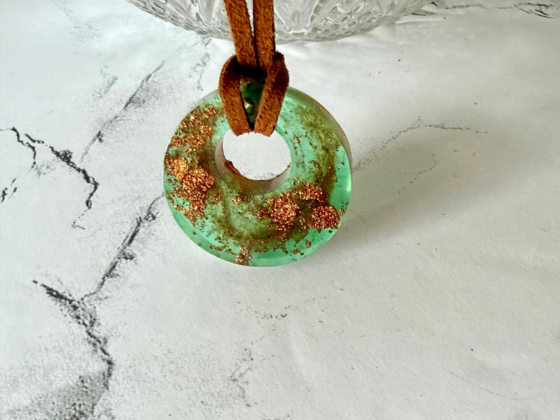 This small resin round is done in green with copper shimmers.