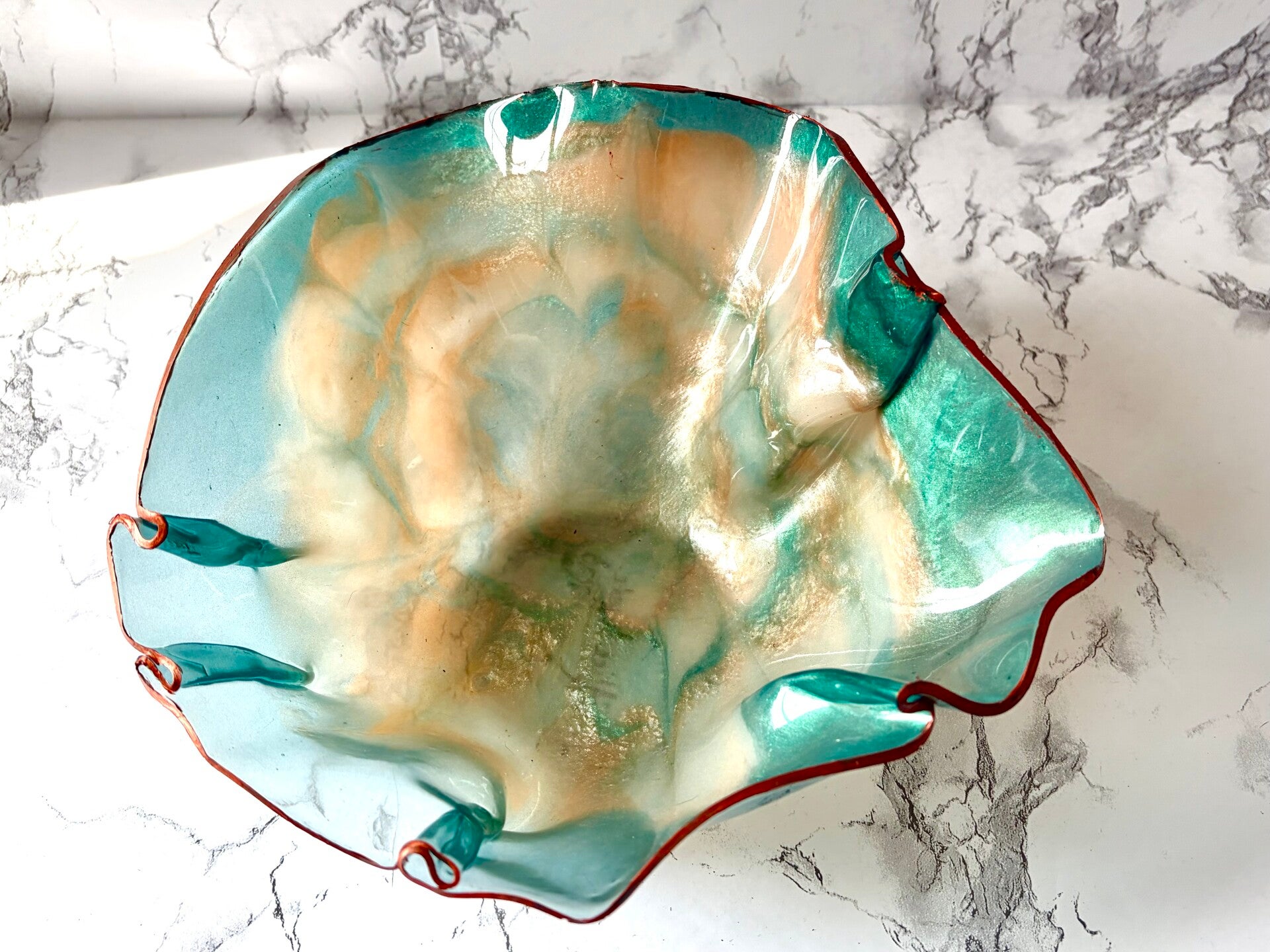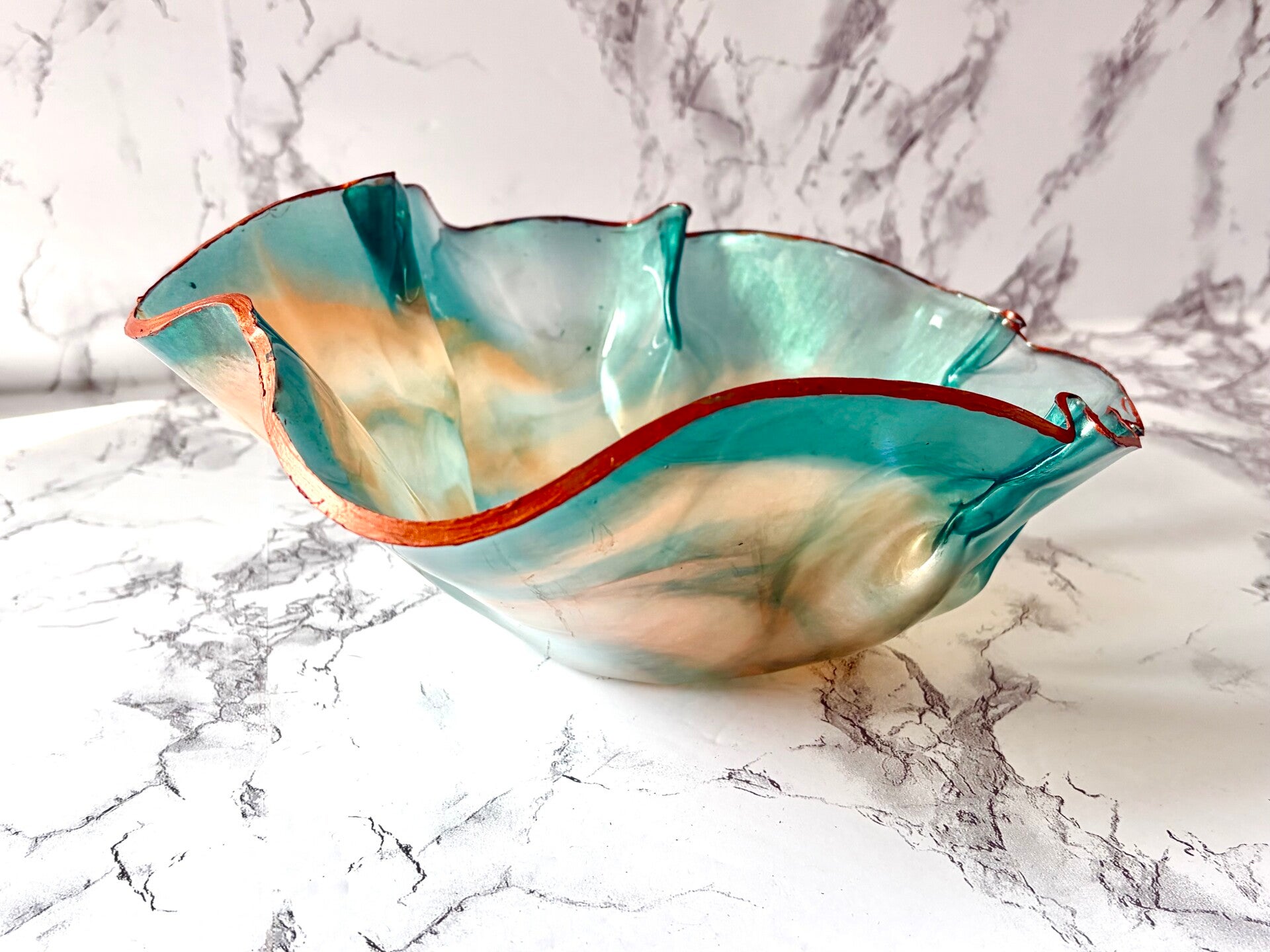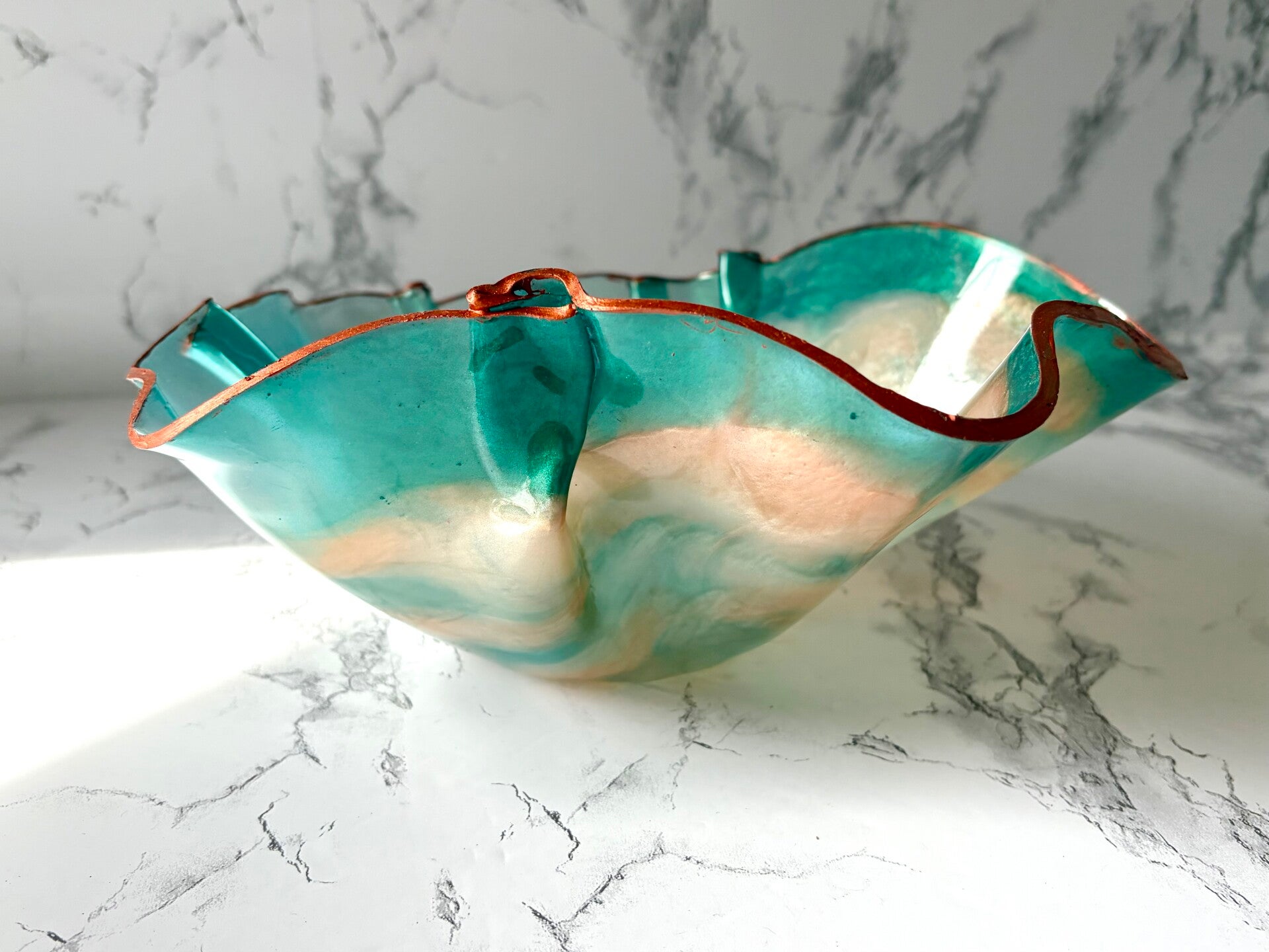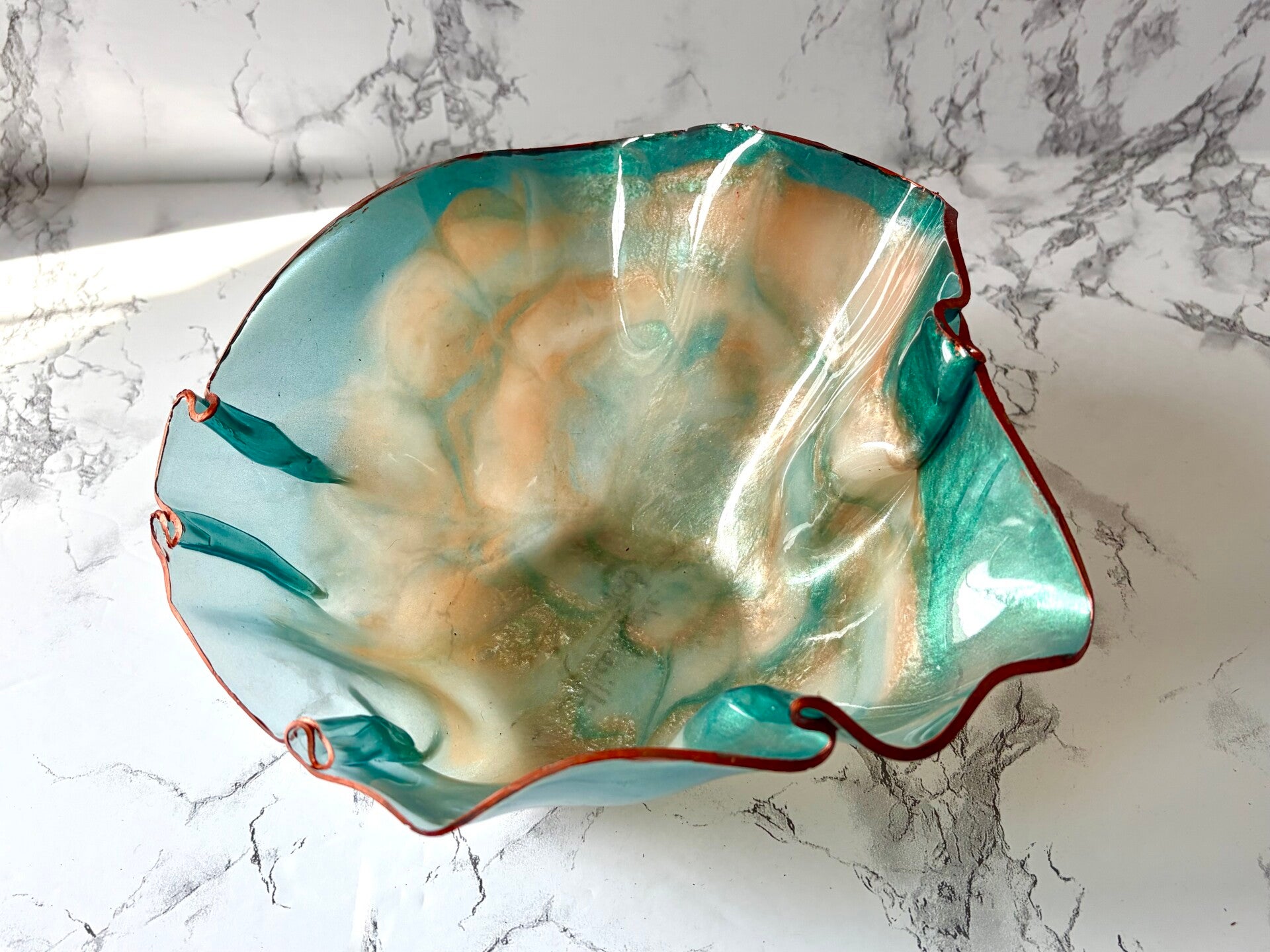 This bowl is done in aqua,peach/coral, and trimmed in a copper color.