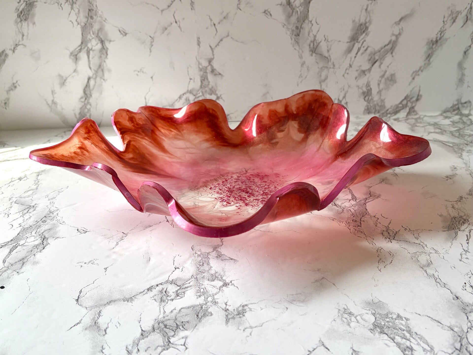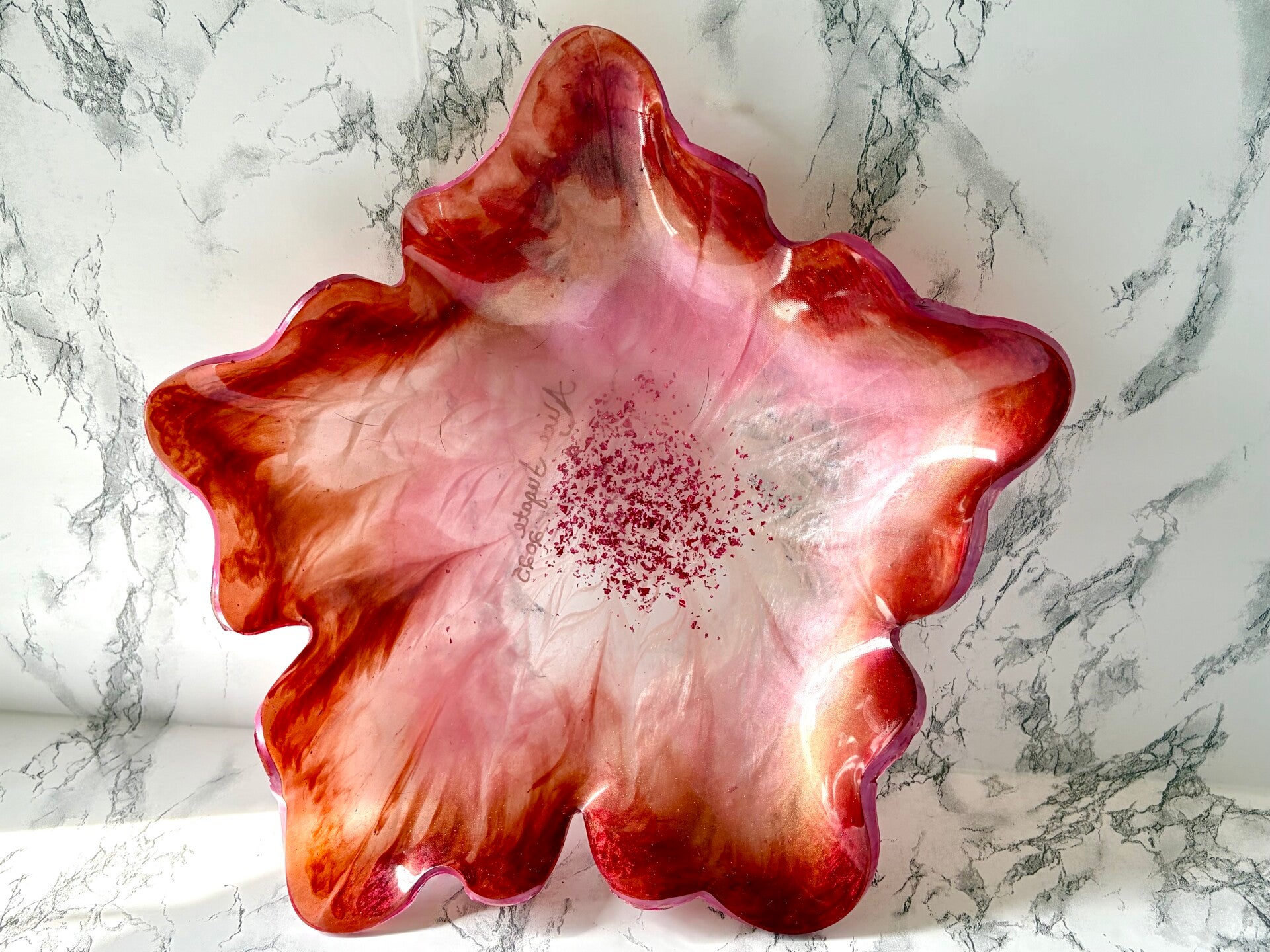 This beautiful flower bowl is done in reds and pink with a glitter center.