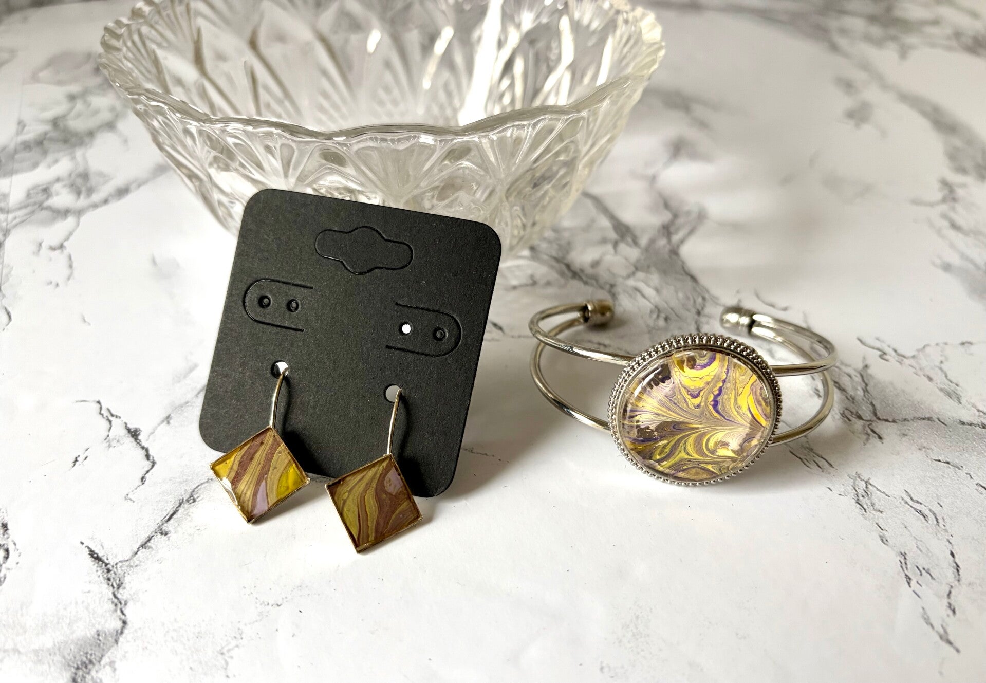 This set is from a paint pour done in yellow and purples.