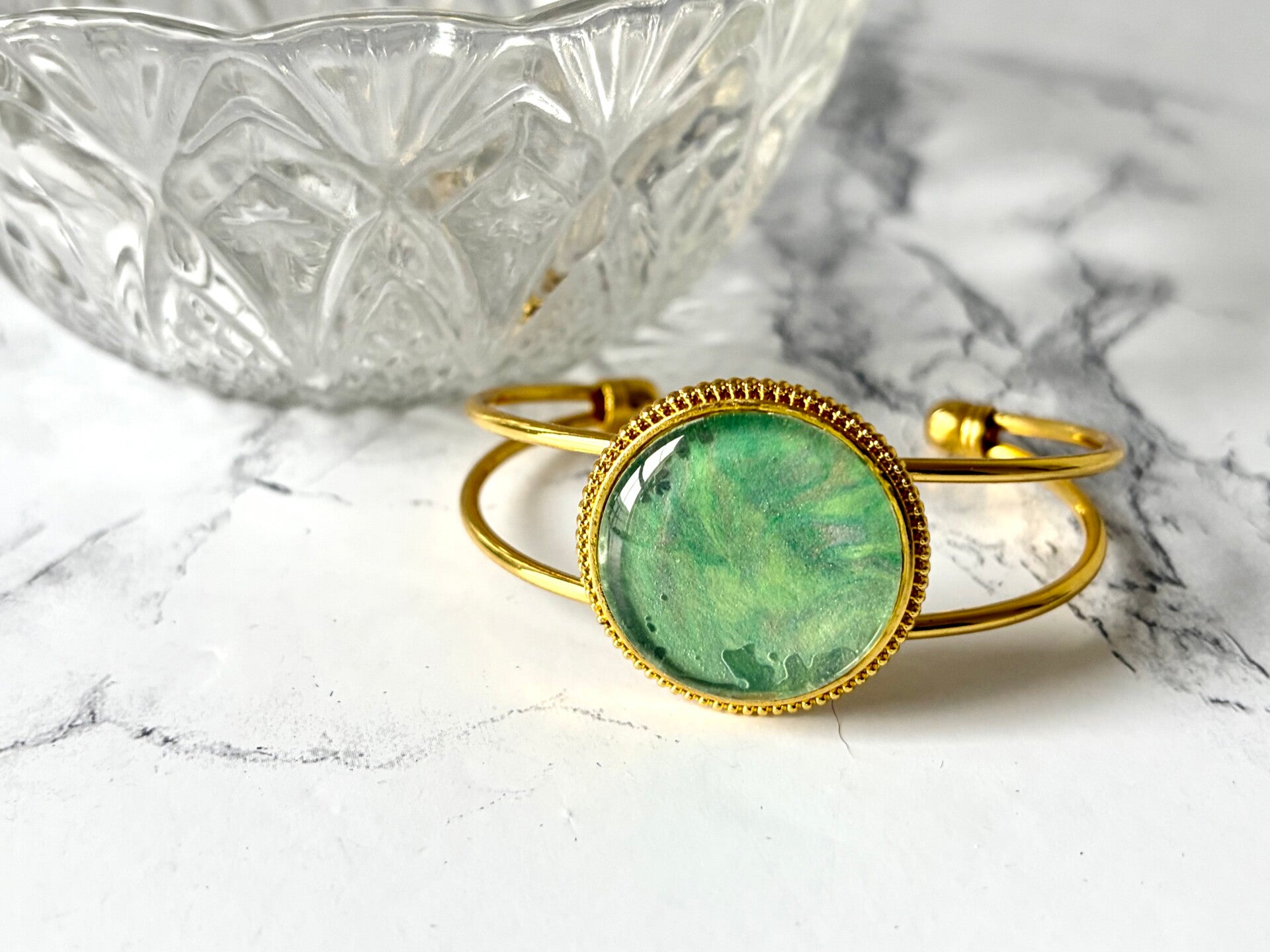 This piece is from a paint pour done in green metalics and hints of pink.