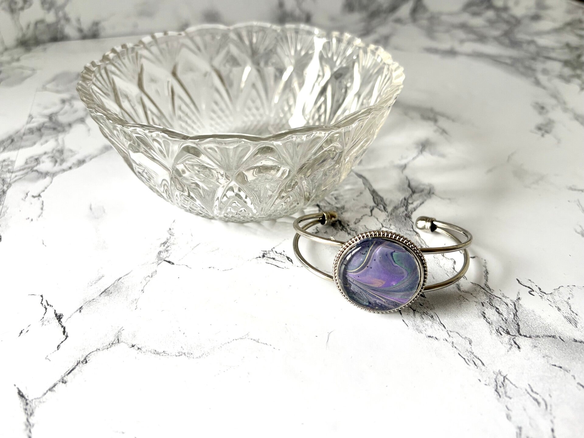 This is from a paint pour done in purples, with hints of yellow, pink and green.
